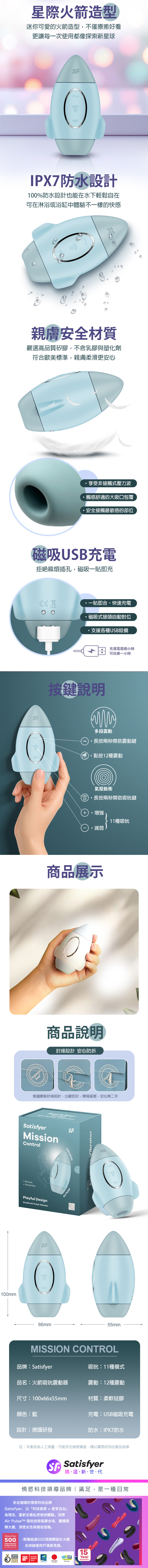 品名:Satisfyer|Mission Contro|火箭吸吮陰蒂震動器 粉藍
