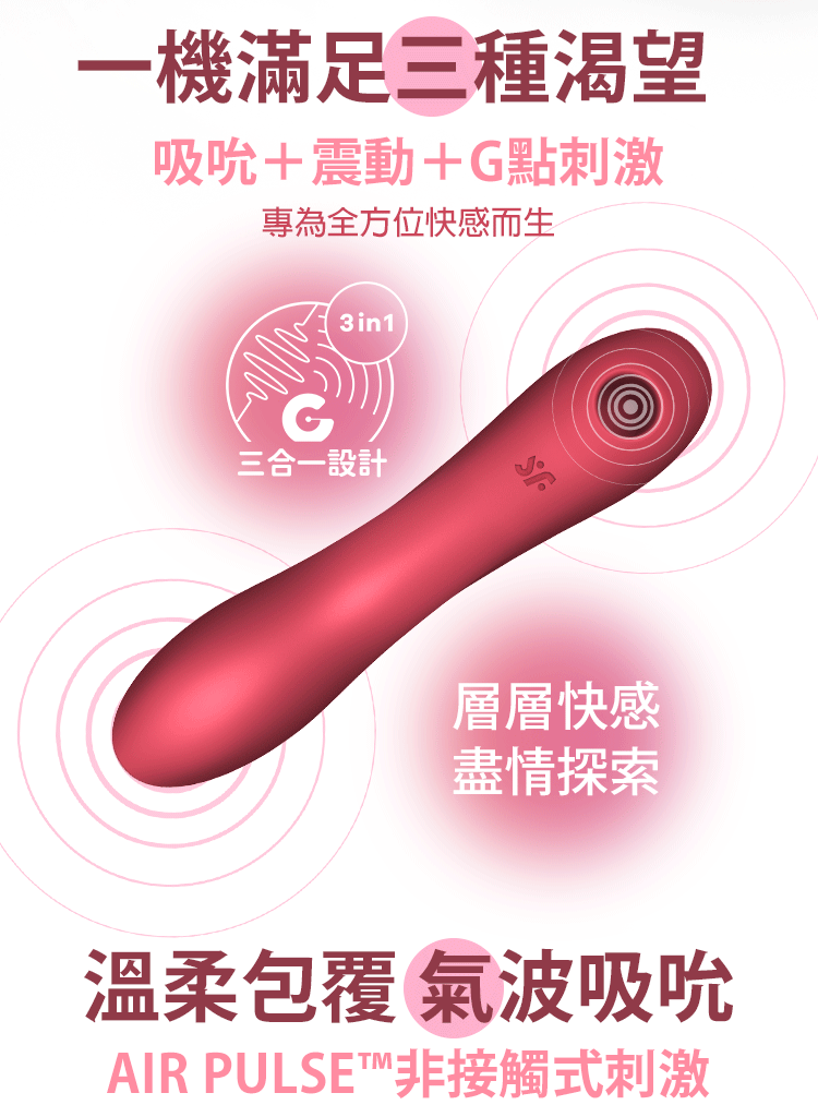 三合一設計,將 吸吮 + 震動 + G 點刺激 融合於一體,
