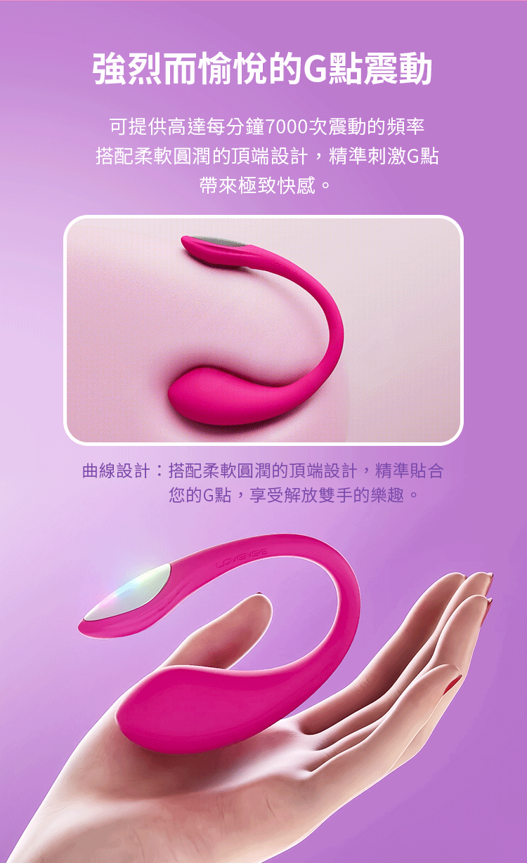 支援手機近距離控制與伴侶遠端連線,並具備可客製震動模式、音樂模式、互動功能等豐富玩法。